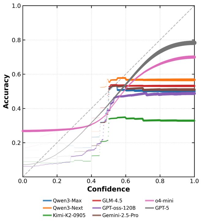 图2展示了前沿模型的响应级置信度校准图,显示出许多模型的准确性与其声明的置信度缺乏关联性。