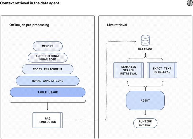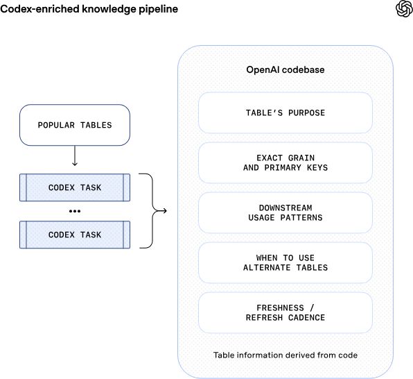 每日凌晨,智能体会系统性地扫描昨天成千上万张数据表的实际使用情况,汲取专家留下的批注与洞察,并调用Codex来解析隐藏在代码中的逻辑。所有这些零散的“知识碎片”被整合为一个统一、标准化的知识图谱。