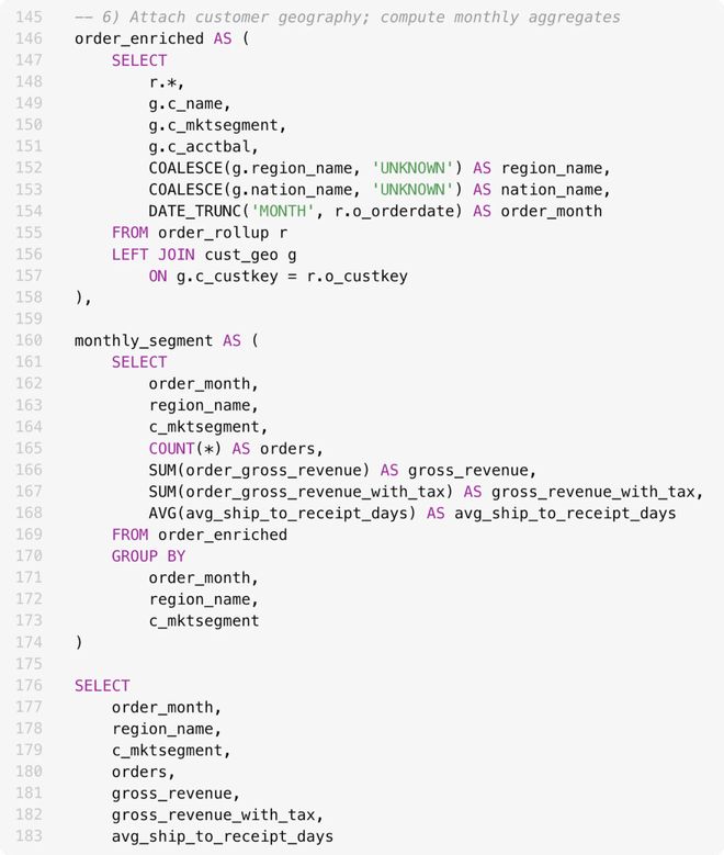 下图中展示的一个包含超过180行的SQL语句,如同一座难以克服的大山——复杂的表连接、聚合操作,任何一个微小的错误都可能导致整个分析失败。