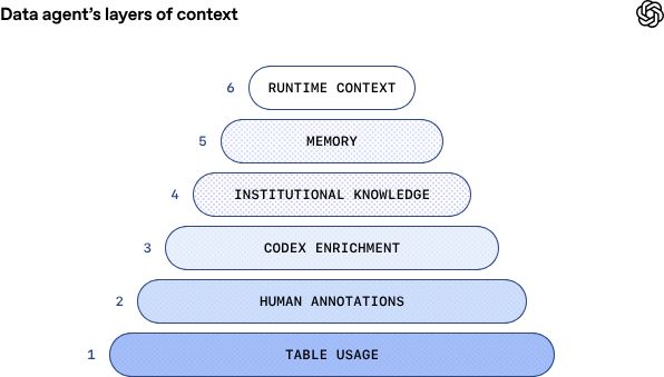 OpenAI内部采取了一项更为激进的措施:利用Codex驱动的数据智能体接管了“查找-理解-生成查询-验证结果”这一系列流程,通过构建六层上下文架构来补全数据语义、接入组织知识并沉淀经验记忆,使工程师能够用提问取代繁琐的手动操作。