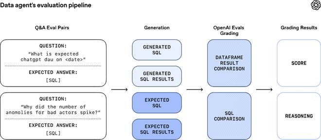 为了避免不断进化的智能体在学习过程中出现偏差,OpenAI团队为每个重要问题配置了手动编写的“黄金标准”查询语句作为基准,并通过Evals API持续监控和评估智能体的表现。