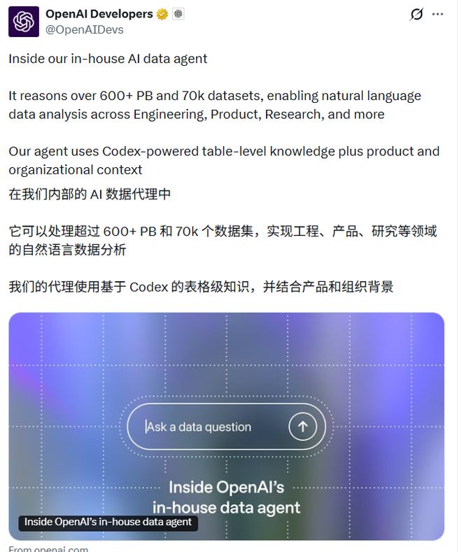 2026年初,大多数企业仍在依赖数据分析师手动编写SQL查询来处理表格时,OpenAI内部发布了一种能够自主思考和自我进化的数据分析智能体,将原本耗时的查询过程缩短到了几分钟。