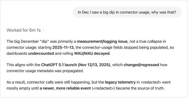 例如当用户询问“十二月连接器使用量为何下降”时,智能体不会仅报告数字变化而是通过机构知识发现这是一个测量或日志记录问题,并与ChatGPT 5.1发布导致的数据收集变动有关。