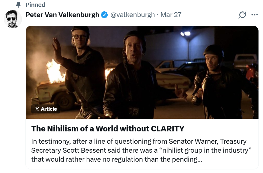 Van Valkenburgh周五在X上发文指出,如果在CLARITY法案等立法以及《区块链监管确定性法案》中拒绝开发者保护,转而追求“短期商业利益”和“当权者持续的善意”,可能会给行业带来“严峻”的未来。