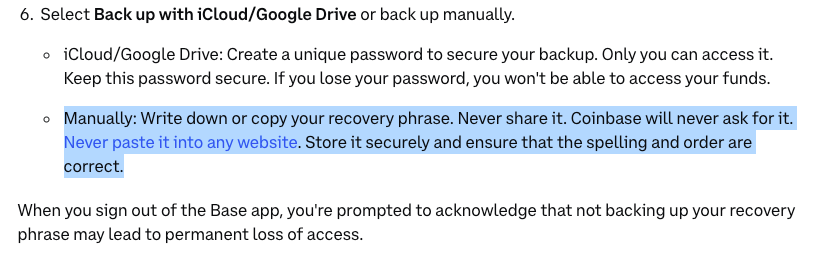 在另一份指南中,Coinbase曾明确警告用户不要将助记词粘贴到任何网站。