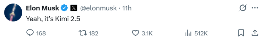 马斯克本人也在社交媒体上确认,“没错,Composer 2就是基于Kimi K2.5”。