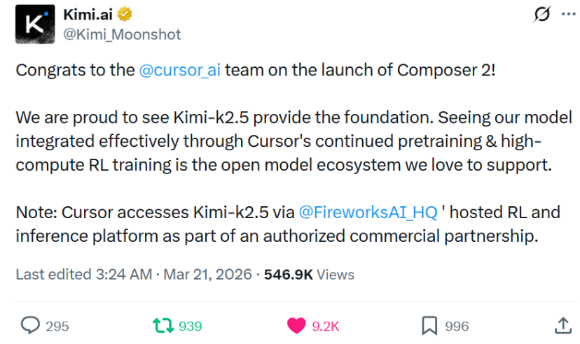 3月21日凌晨,Kimi官方账号在社交平台上发布声明,祝贺Cursor团队发布Composer 2,并自豪地表示Kimi K2.5为该项目提供了基础。