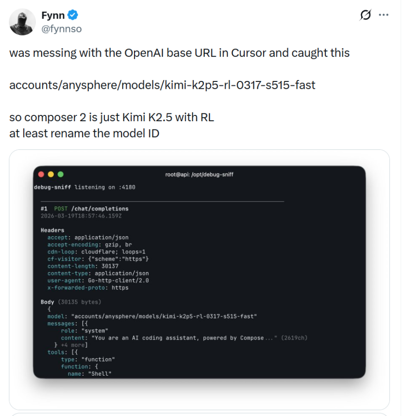一名开发者在测试Cursor的OpenAI兼容接口时,发现API返回的模型标识符为“accounts/anysphere/models/kimi-k2p5-rl-0317-s515-fast”。