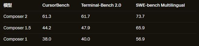 在CursorBench上,Composer 2的得分达到了61.3,相比上一代Composer 1.5的44.2,有了接近40%的提升。