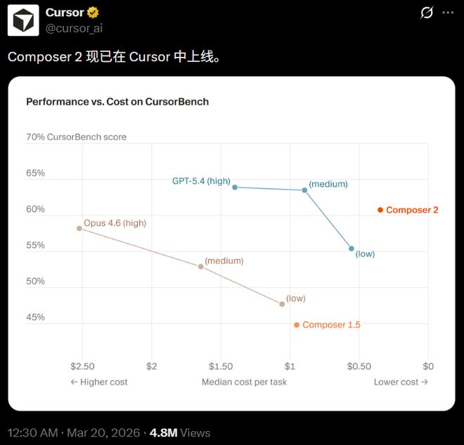 虽然能力不是最强的,但成本确实是Composer 2最锋利的武器。