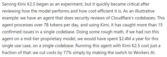 在官博中,Cloudflare透露了一个惊人的数字:他们内部有一个基于K2.5的安全审计Agent,每天处理超过70亿智元(token)。