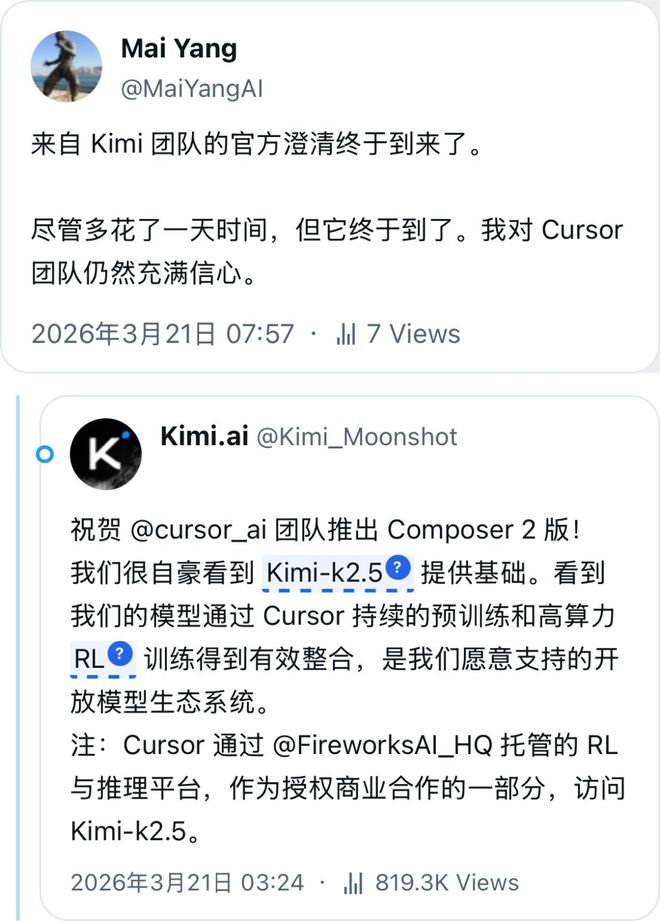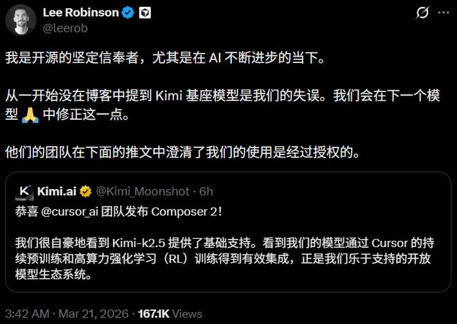 数据和实力之外,这场Cursor风波还意外地给K2.5送上了一波全球级的信用背书。