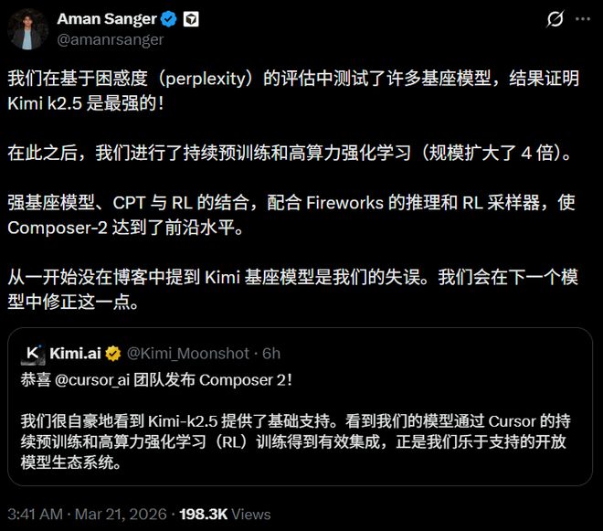 几乎可以肯定,Composer 2是基于Kimi K2.5进一步训练的结果。