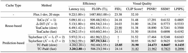 在文本到图像生成任务中,TC-Padé 在 FLUX.1-dev 上展现出非常突出的效率 — 质量平衡能力。实验结果表明: