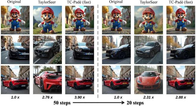 实验表明,TC-Padé 方法在 20 步采样下依然能够保持更高的视觉质量和生成效果。相比之下,其他加速技术在这种低步数设置中往往会导致明显的画质下降。