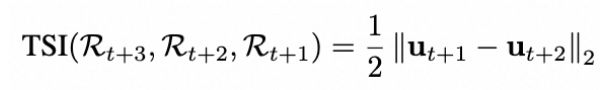 除了预测方式的设计外,TC-Padé 还引入了一个轨迹稳定性指标(Trajectory Stableness Indicator, TSI),用于判断当前时间段是否适合跳过计算、直接使用预测结果。其定义为: