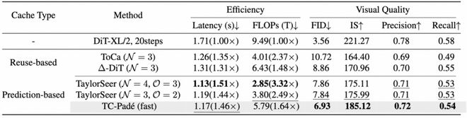 表 3 TC-Padé 在 DiT-XL/2 上的定量结果,展示了其在类别条件图像生成任务中的稳定泛化能力