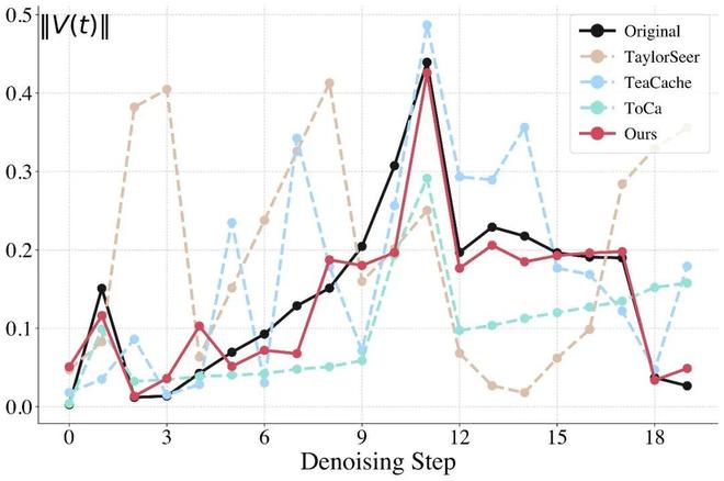 尽管这些方法在较高的采样步数(如50 步)中显示出一定的加速效果,但在实际工业场景更常见的 20 至 30 步低步数采样下,其局限性变得尤为突出。具体来说,在这种情况下,特征变化不再平滑,缓存复用方法可能会因为缓存信息与当前状态不匹配而产生偏差,多项式外推类方法则可能因误差积累导致轨迹漂移。