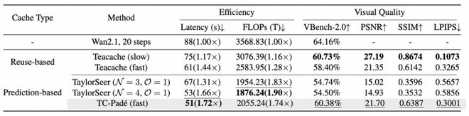 表 2 在视频生成任务中的效果对比。相较于其他方法,TC-Padé 在保证视频内容稳定性的同时实现了更高效率
