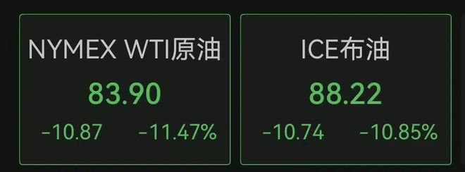 国际原油市场方面,WTI油价跌破了每桶84美元的关口,日内跌幅达到11.4%。布伦特原油价格也下滑超过10%。