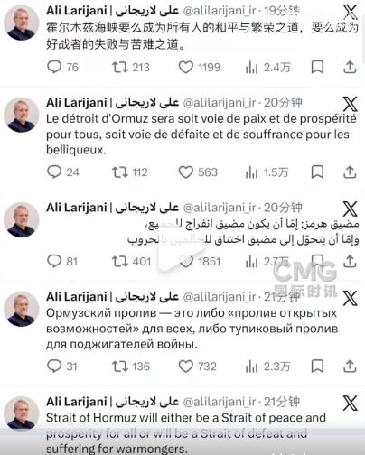 拉里贾尼还通过社交媒体平台用六种语言回应美国总统特朗普关于对伊采取更强硬军事行动的言论,其中指出:“伊朗不会被任何威胁所吓倒。”