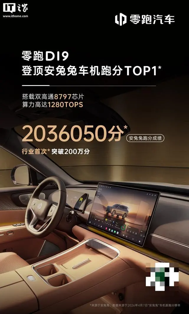 零跑汽车官方今日发布消息,零跑 D19 在安兔兔评测中获得 2036050 的高分,成为业内首个突破 200 万分大关的车型。