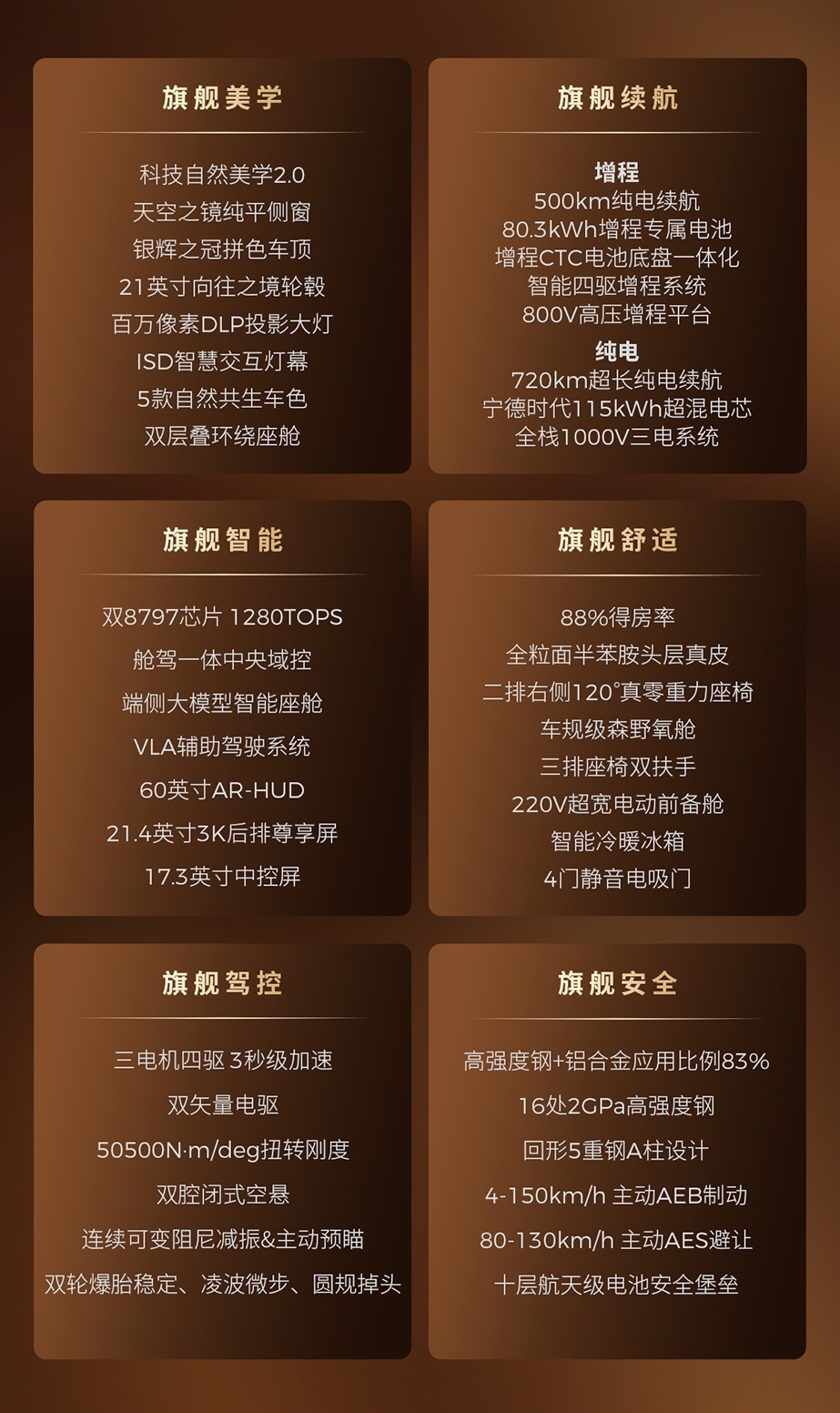 新车长宽高分别为 5252/1995/1780mm,轴距为 3110mm,提供 6 座 / 7 座可选;搭载双 8797 芯片、80.3kWh 超大增程专属电池(宁德时代超混电芯)、车规级森野氧舱、电动开合冷暖冰箱、12 层奢享级座椅、二排右侧真零重力座椅、三排超大空间贵宾座。
