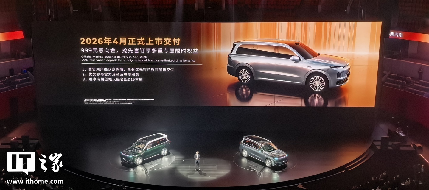 零跑 D19 已于去年 11 月 1 日正式开启盲订,支付 999 元意向金可享优先排产、限量 2000 份创始人签名 D19 车模及后续活动优先参与权 + 尊享服务在内的多项权益。