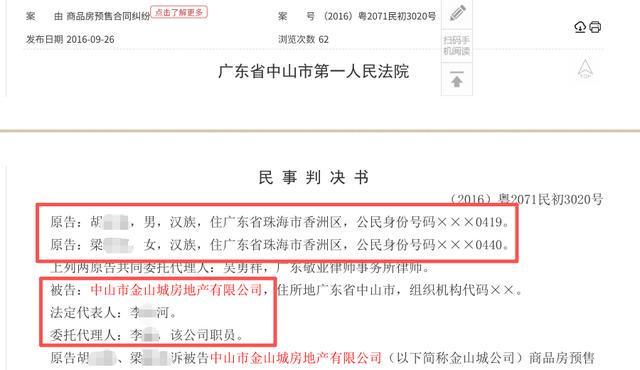根据裁判文书网公布的《民事判决书》显示,“(2016)粤2071民初3020号”案件是一起商品房预售合同纠纷案。原告为胡某和梁女士;被告为中山市金山城房地产有限公司,法定代表人为李某。