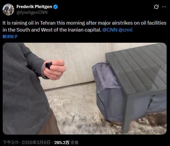 弗雷德里克表示:“在伊朗南部和西部石油设施遭受大规模空袭后,这座城市降下了‘石油雨’。”