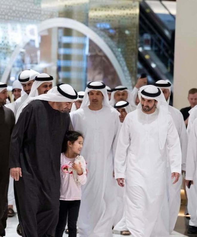 在这段视频中,可以看到阿联酋总统穆罕默德·本·扎耶德·阿勒纳哈扬携同众多随行人员现身迪拜购物中心大厅,在celine精品店附近,一名手抱布偶的小女孩主动上前打招呼。总统停下脚步,弯腰微笑着与小女孩合影留念。发布者透露,她是带着女儿来迪拜游玩的游客,没想到能遇到这样幸运的一刻。