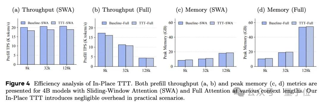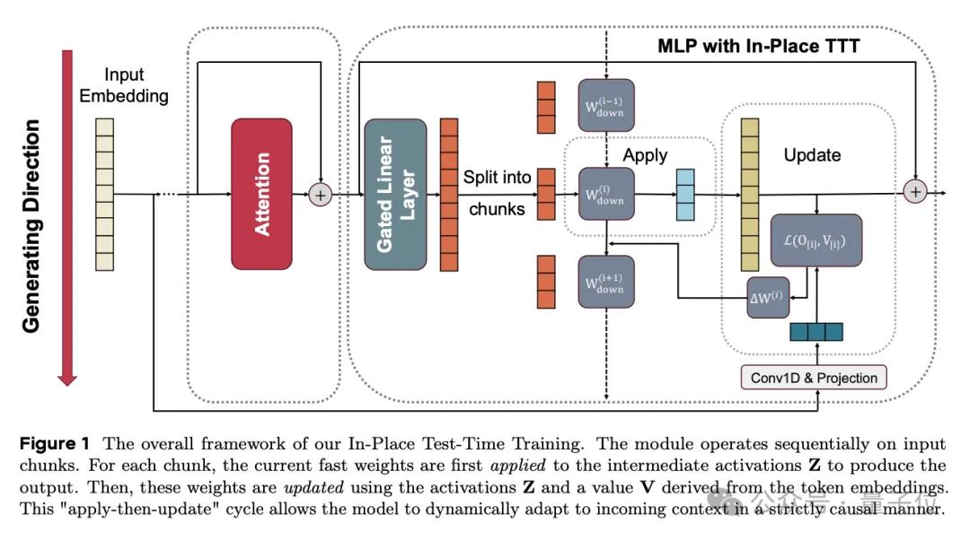 In-Place TTT是对MLP进行改造,保留了原有的注意力层,这就使得该方法可以实现分块更新,不用再逐Token去处理。