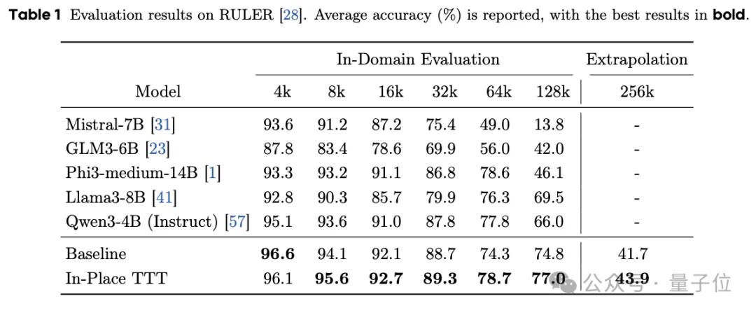 实验表明,In-Place TTT能大幅提升现有模型(如Qwen3-4B)在128K甚至256K长上下文任务中的表现。
