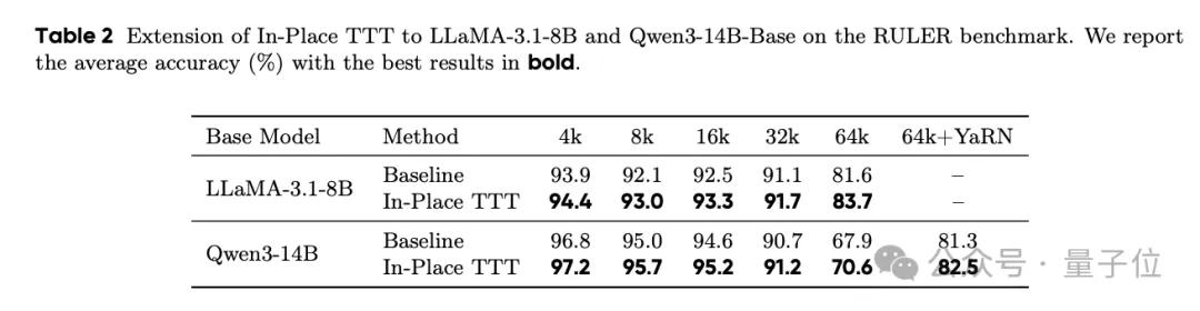 实验结果表明,在Qwen3-4B、Llama3.1-8B和Qwen3-14B等大型语言模型中引入In-Place TTT后,它们在处理长文本任务时性能显著提高。