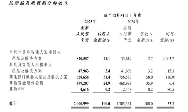 从财报数据来看,截至2025年,该公司全尺寸具身智能人形机器人(工业机器人)业务已达到8.2亿元人民币的营收水平,并且毛利润为4.48亿元,同比增长率分别达到了2203.7%和1568.1%。