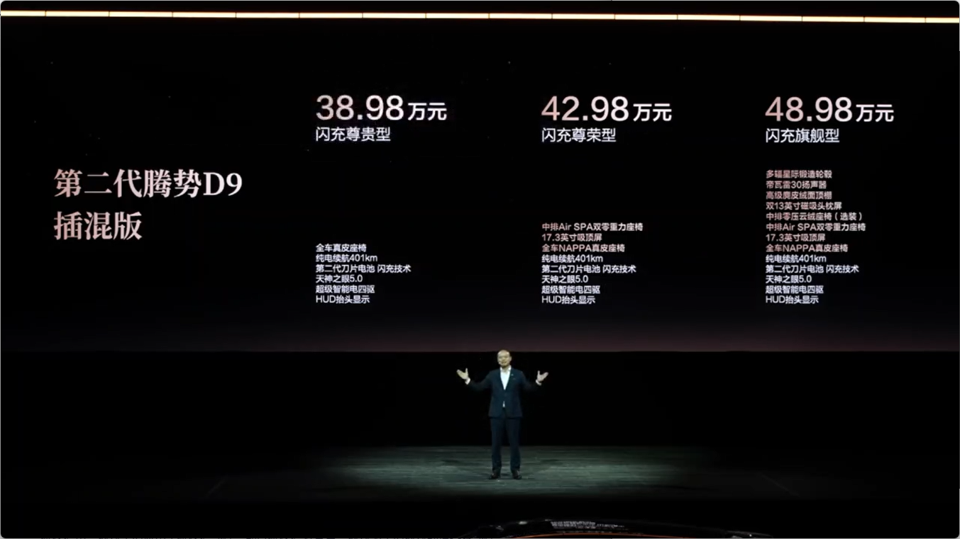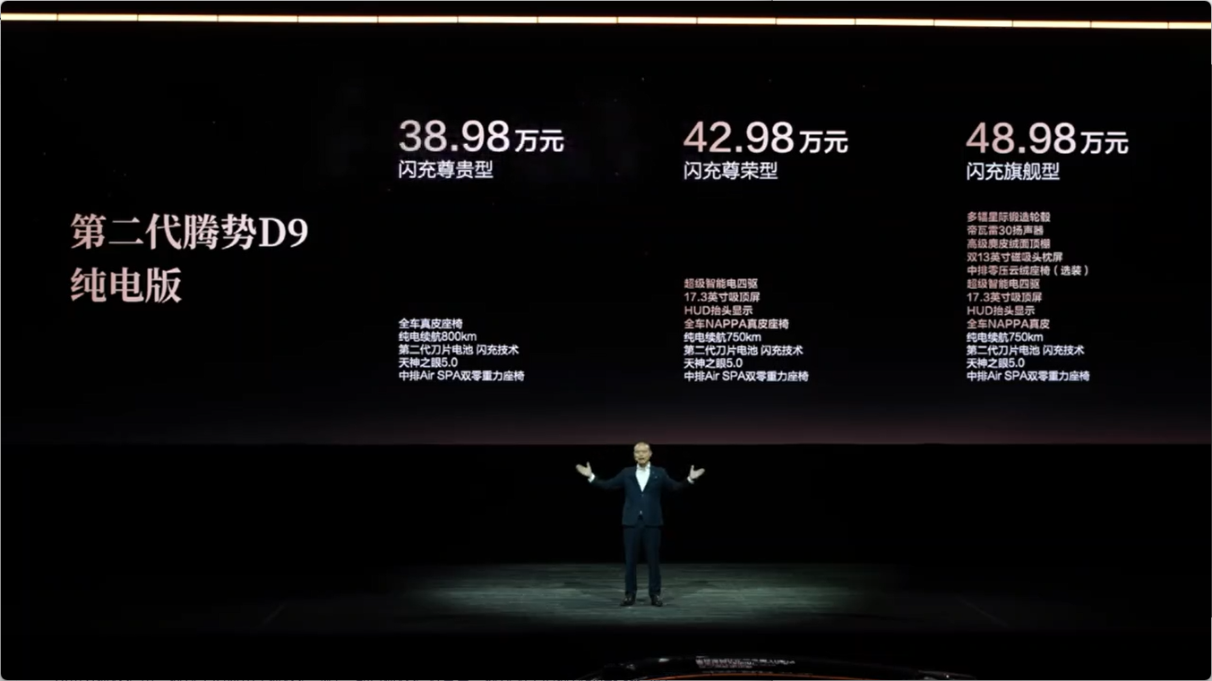 IT之家 3 月 29 日消息,比亚迪第二代腾势 D9 MPV 车型今日正式开启预售,新车共推出 6 款配置车型,预售价格为 38.98 万元-48.98 万元,混动与纯电版本同价。官方称,该车型将于 4 月陆续抵达全国经销商门店。预售期间下订,加送 6 个月总共 18 个月免费闪充权益。