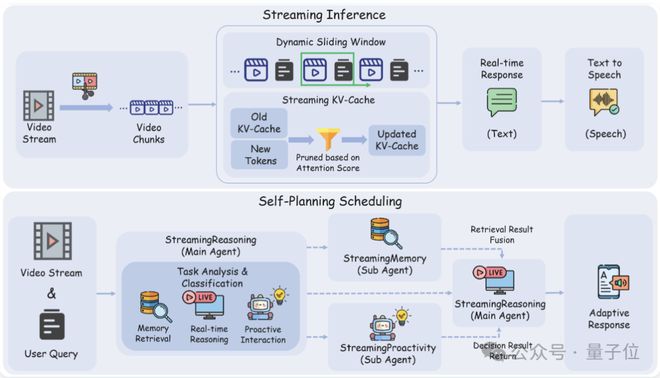 在实时流式推理方面,系统会将视频流拆分成细小片段,并通过动态滑动窗口来控制上下文范围,避免无效信息堆积。