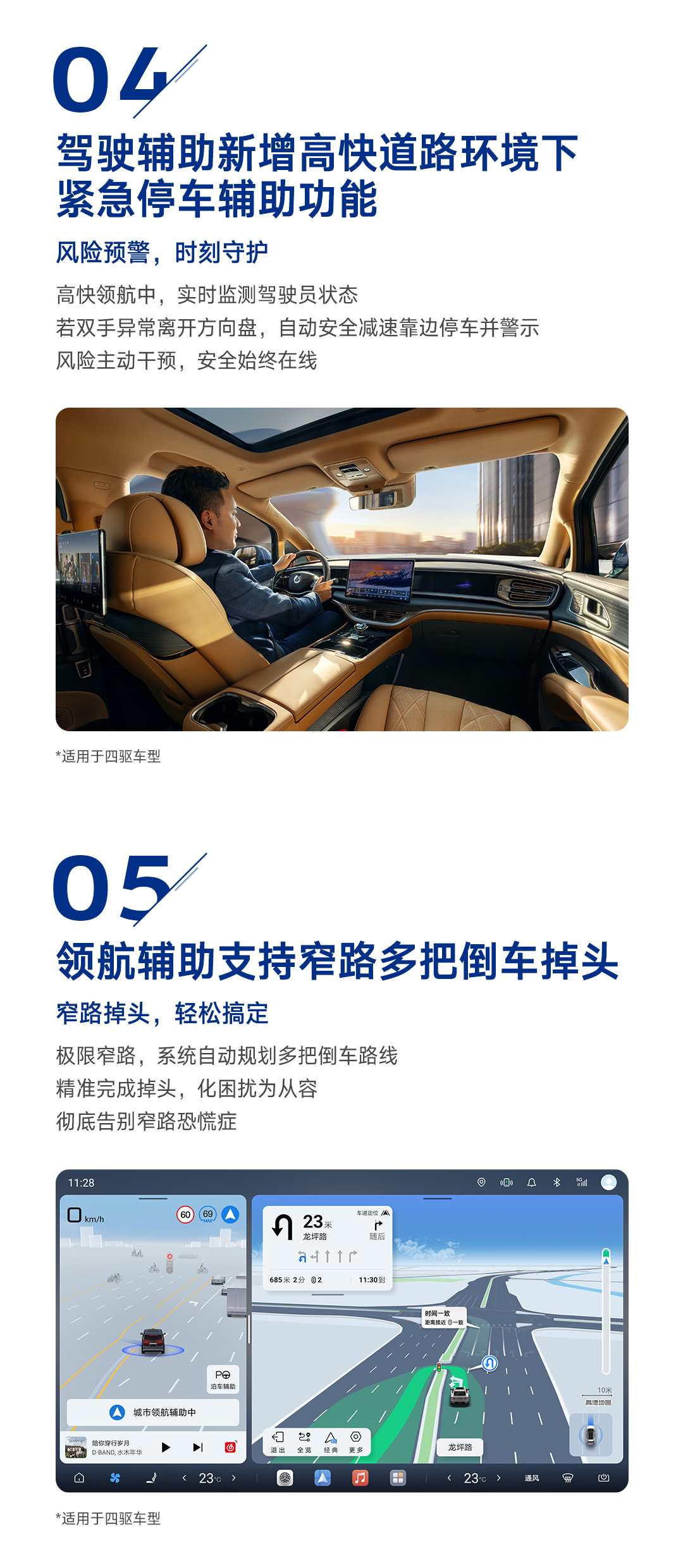 新增高快速道路下的紧急停车辅助功能,在领航驾驶过程中自动检测驾驶员状态,若双手长时间离开方向盘,则会启动安全减速和靠边停车机制并发出警报;