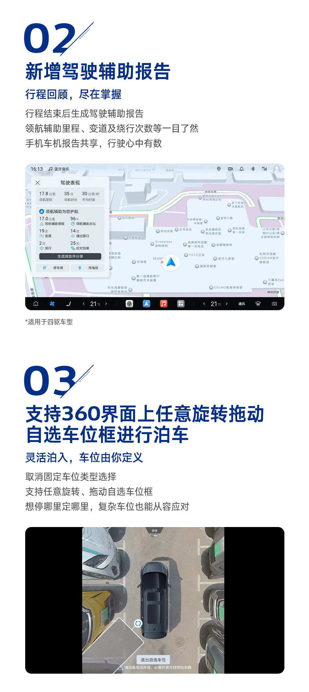 行程结束后生成驾驶辅助报告,涵盖领航里程、变道次数及绕行记录等信息,并可在手机和车机上共享查看;