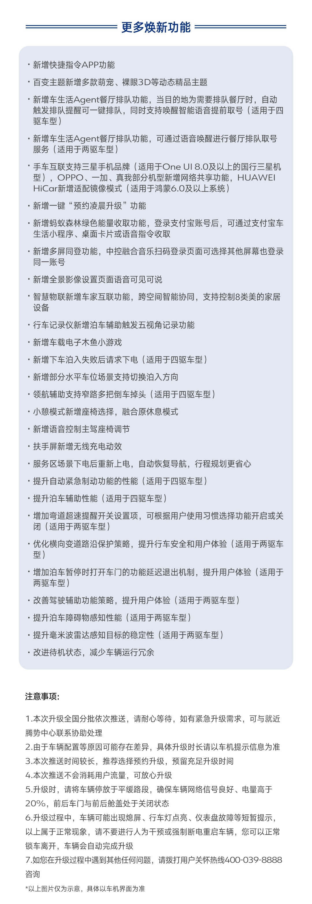 针对两驱版本增加了通过语音指令进行餐厅排队的功能,并且三星手机用户可以通过 One UI 8.0 及以上系统的设备实现网络共享,OPPO 和真我部分型号也添加了同样的功能。HUAWEI HiCar 用户则可以在鸿蒙 6.0 或更新系统上使用镜像模式;