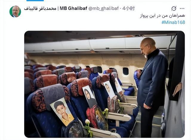 为了表达对168名遇害儿童的悼念之情,伊朗将此次代表团专机命名为“米纳卜168”,并在其舷窗内摆放了学生们的书包和照片。卡利巴夫面对空座位前的照片神情凝重,并在社交媒体上发文:“我的同机伙伴。”