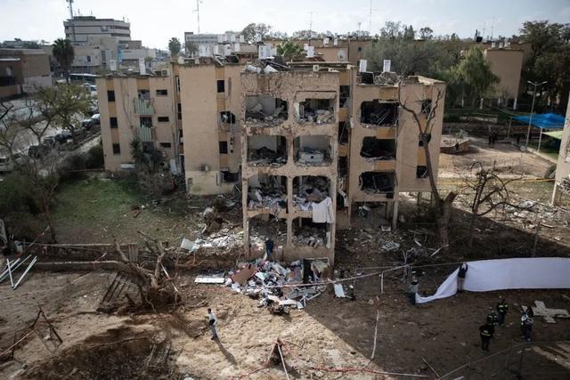 3月22日,以色列南部城市阿拉德遭受导弹袭击,当地一座建筑受损严重。
