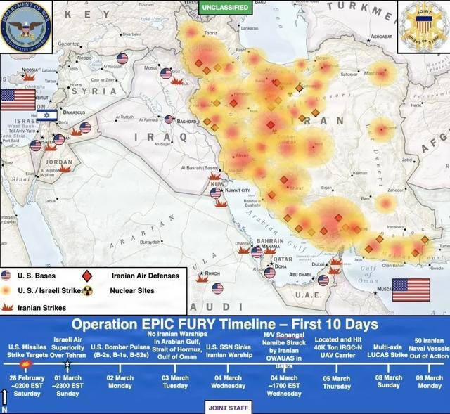 另一方面,B-1和B-52轰炸机可能仍会在伊朗西部地区活动,最近几周,压制和摧毁防空系统一直是该区域的重点任务,而深入伊朗东部空域行动的风险仍然很高。一份五角大楼10日发布的示意图显示,自上月底以来,大部分空袭集中在伊朗西部和沿海地区。