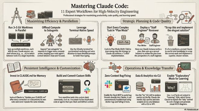 掌握Claude Code:Boris Cherny团队精选11个高效工程工作流程。从Plan Mode开始规划,到高级工程师的审核博弈,再到持久化CLAUDE.md记忆,全过程可视化管理。