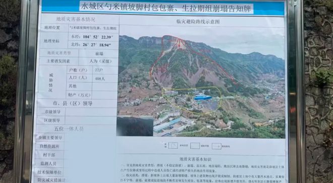 从政府的崩塌告知牌看,坡脚村的地质灾害,主要诱发因素指向人为——采煤。