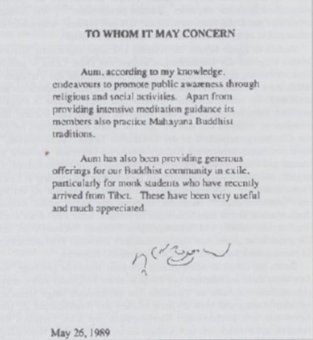 在一份声明中,十四世达赖为奥姆真理教签署了一份文件,表达了对该组织的支持,并感谢其对佛教社群的贡献。