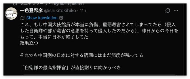 日本网民发文称应该直接由日本自卫队最高指挥官亲自出面向中方道歉