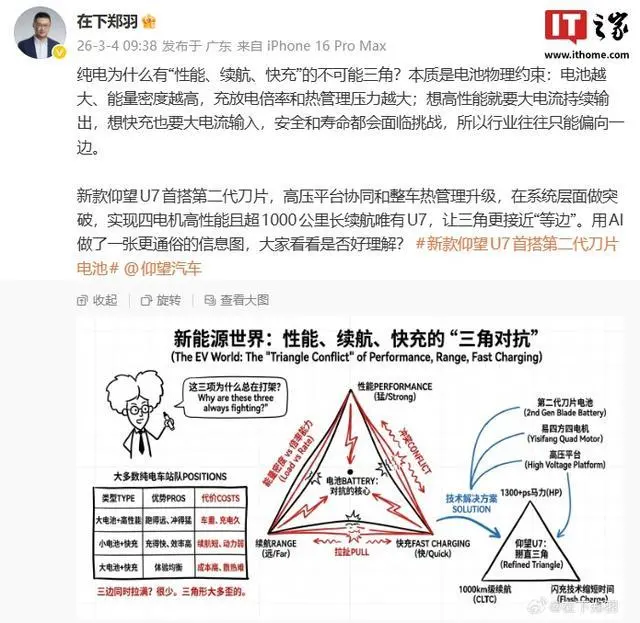 近日,比亚迪仰望汽车产品中心的郑羽总监就“纯电动汽车如何难以同时兼顾性能、续航和快充”这一问题进行了详细解释,并指出其根源在于电池的技术限制。