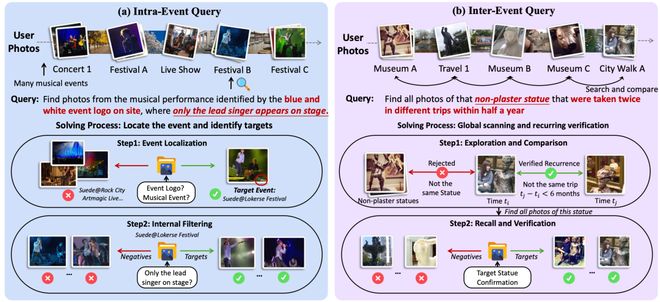 2.Inter-Event 查询(占 53.3%)” 跨越整个相册的多段经历,理解他们之间的关联关系”。比如 “我曾经在半年内的两次不同旅行中拍到过有一座非石膏雕像,请找到包含这个雕像的所有照片”。模型需要在所有旅行照片中全局扫描、识别同一座雕像、核实时间约束,再召回全部相关照片。