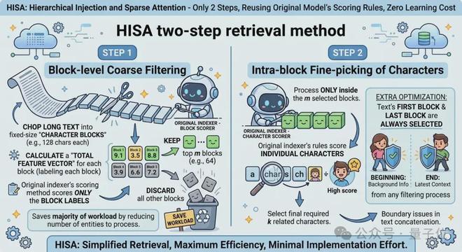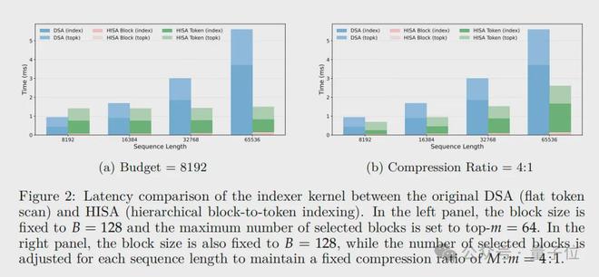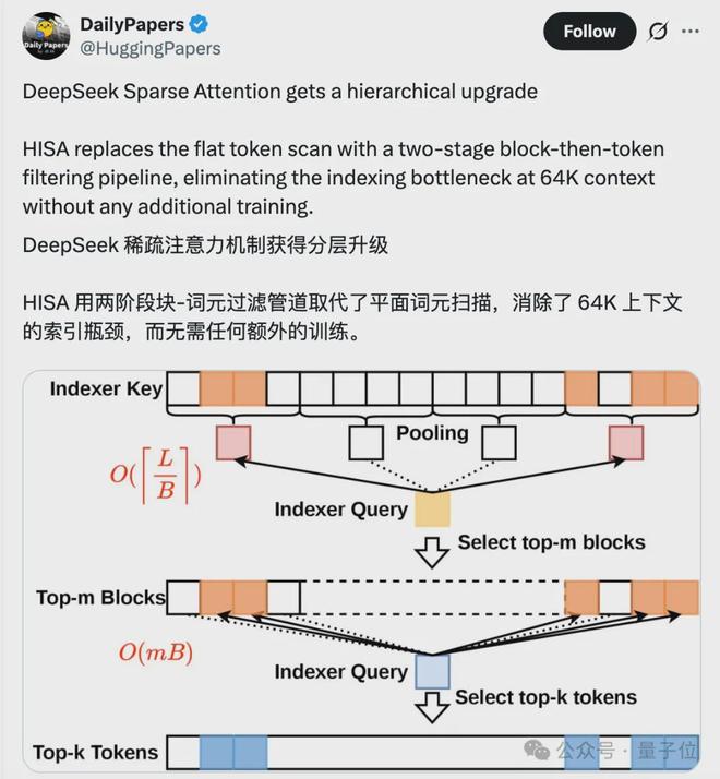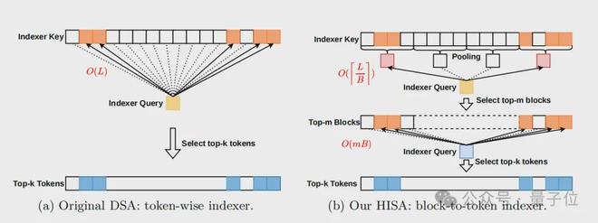 HISA把原索引器每一层 O (L²) 的算力成本,降到了O(L²/B + L×m×B)(B 是块大小、m 是选的块数)